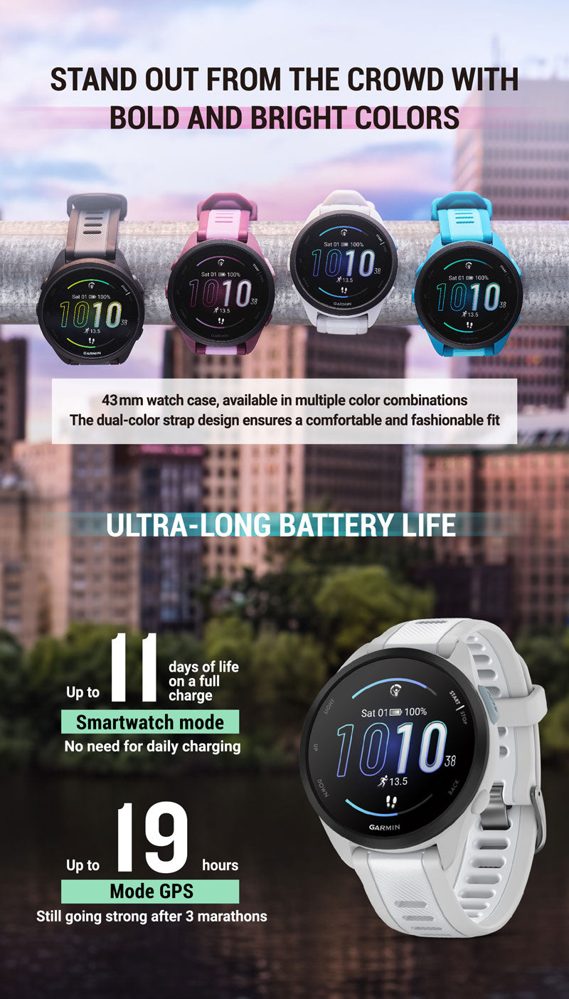 You don’t just run. You’ve moved beyond that. Which is why you need Forerunner 165 — the purpose-built GPS running smartwatch that helps you meet your goals with personalized adaptive training plans and a bright display to light up your progress.